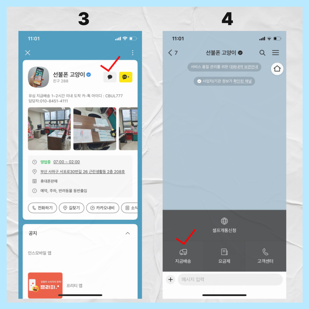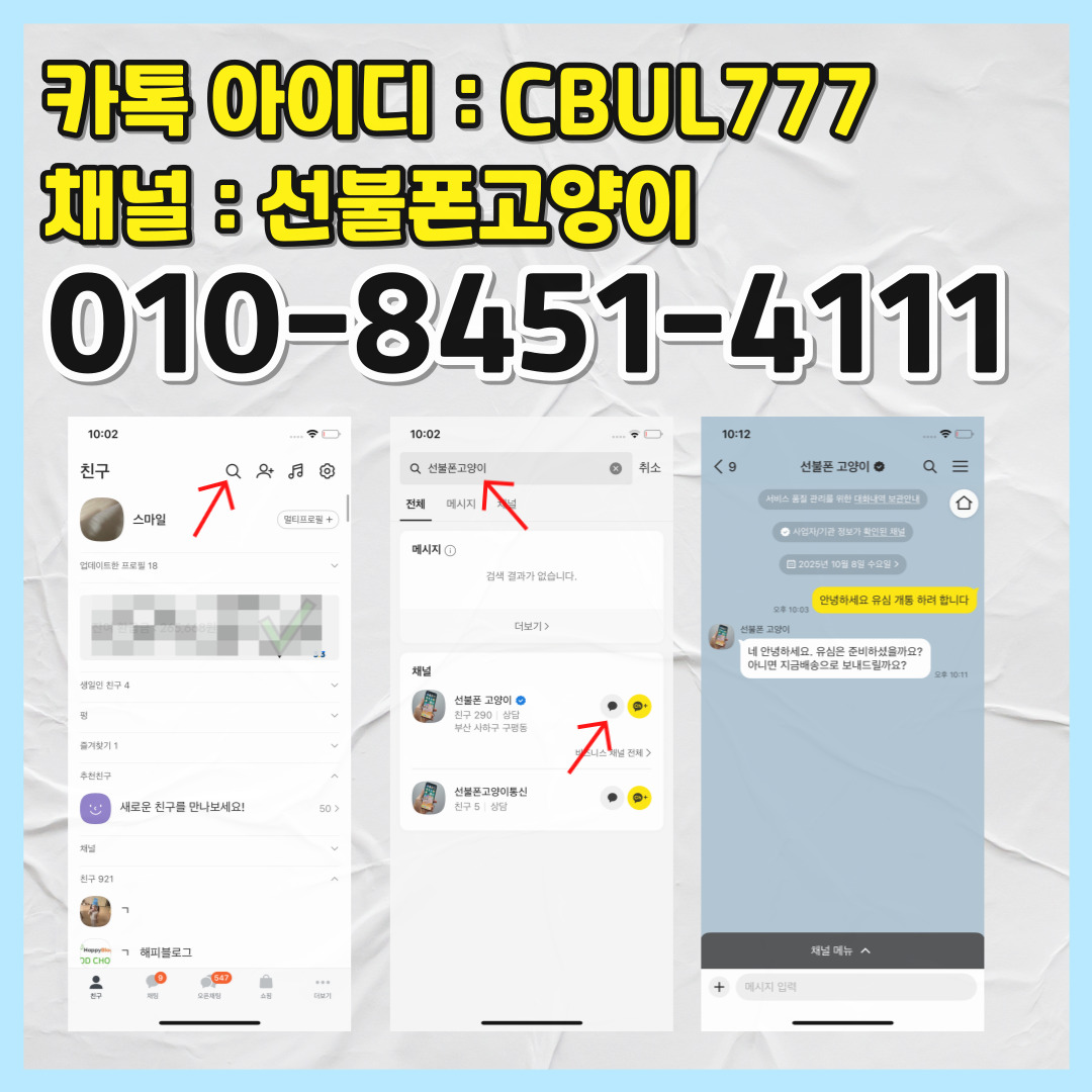 지금배송은, 카톡 우측 상단 검색창에서 '선불폰 고양이'를 찾아서 클릭한뒤,