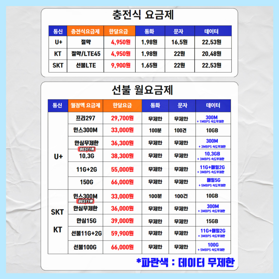 필요한 거에 맞춰 월 요금제나 충전식 선택하면 됩니다.