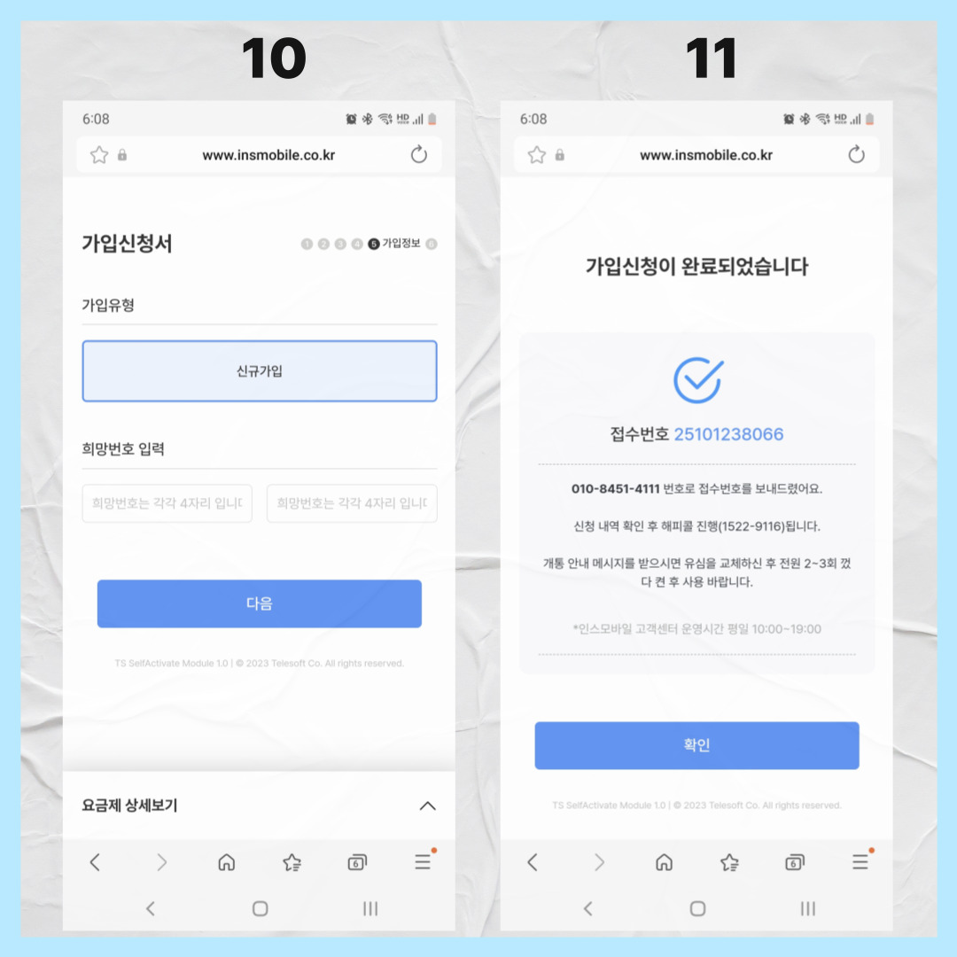 5~10분 지나면 개통 완료되고, 전원 2~5번 껐다 켜면 막혔던 폰이 정상적으로 작동합니다.